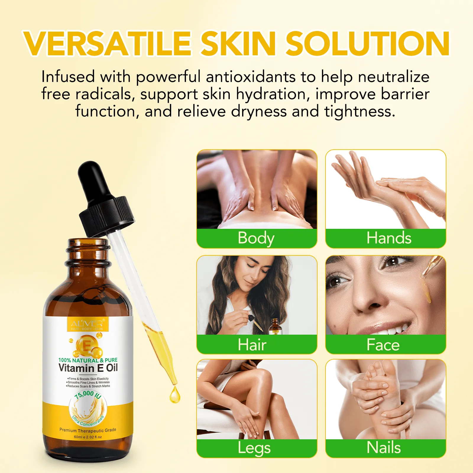 Vitamin E forms a protective barrier that locks in moisture, improves elasticity, and leaves the skin looking healthy and glowing.